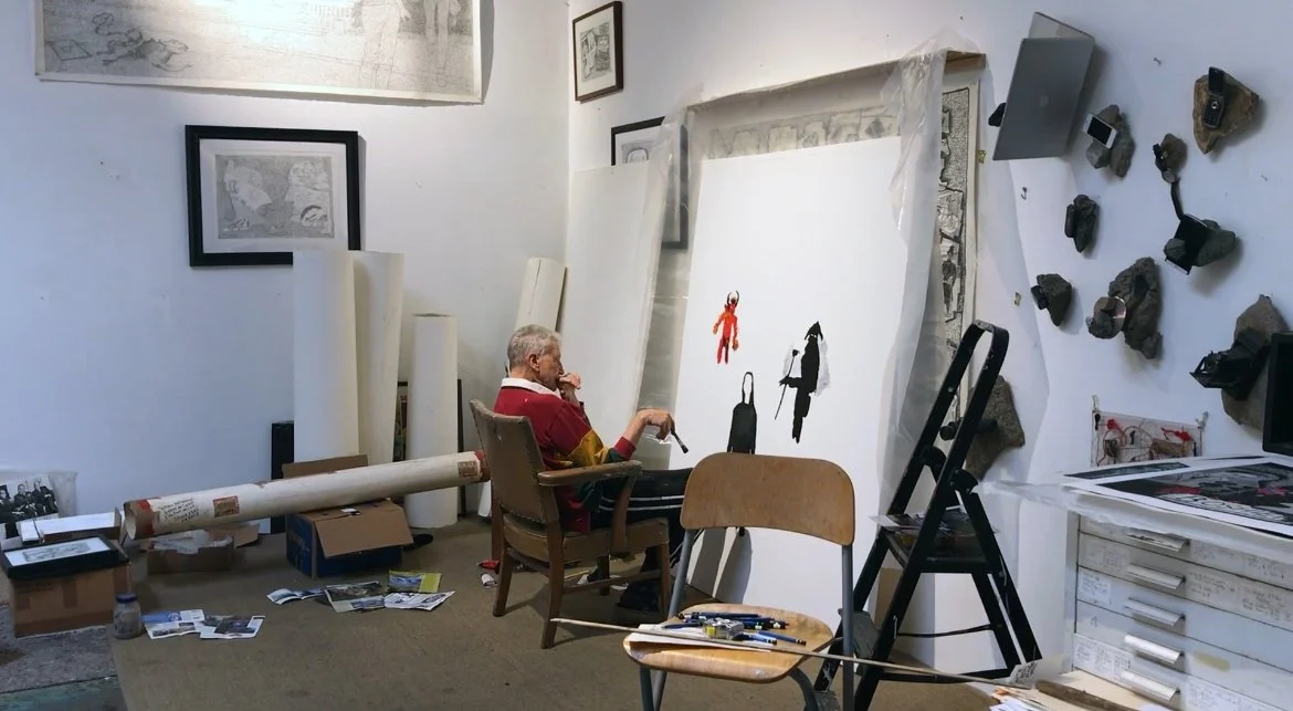 While the film closely follows the making of a specific painting or drawing, Boshier tells off-hand stories commenting on and illuminating his practice. He remarks, ‘it was Degas, of all people, who said, ‘the making of a painting is like the perpetration of a crime - the artist never paints what he sees; he always paints what he wants other people to see’.