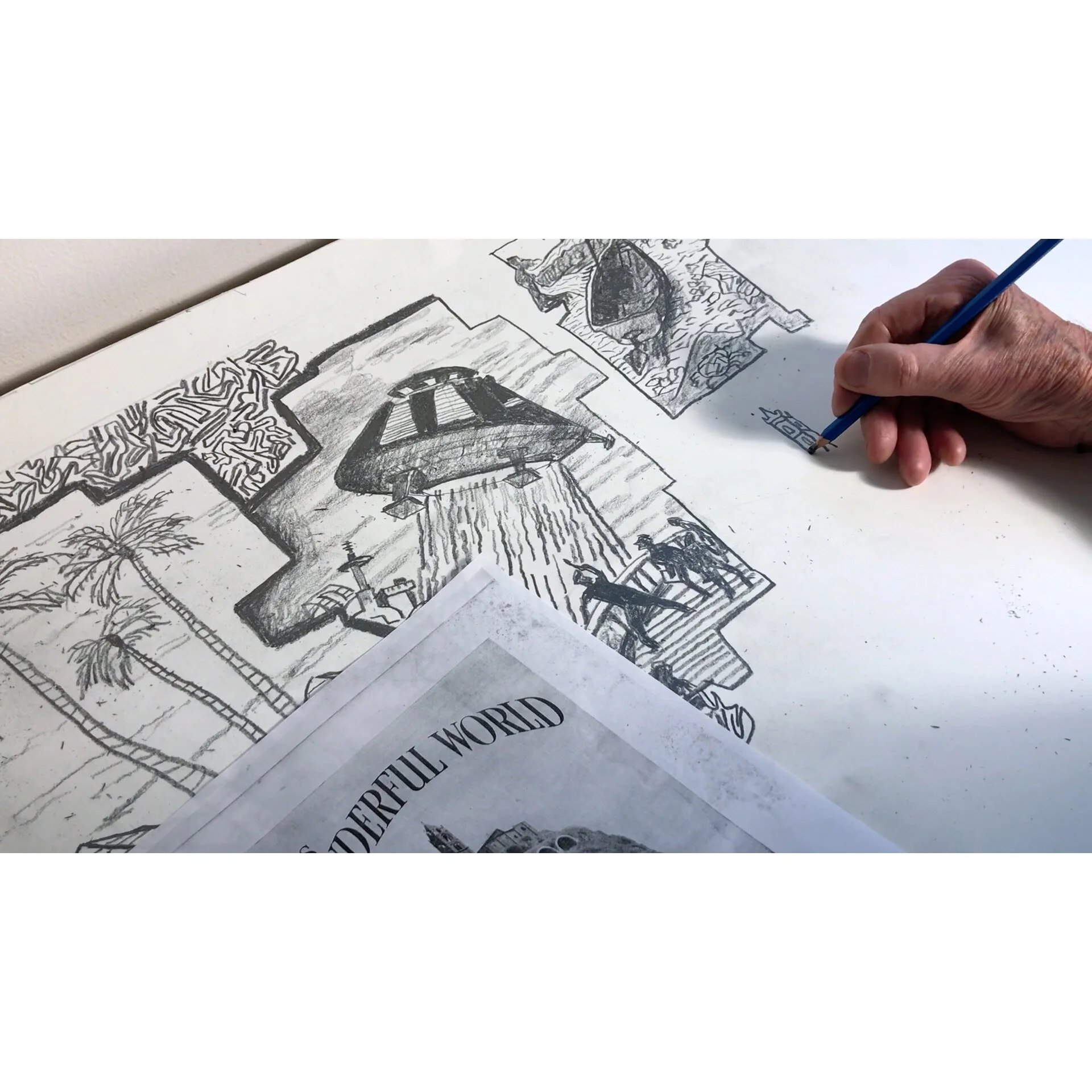 Fragments covers the trajectory of Derek Boshier working between a giant drawing, World News, which is about ‘the contrasts between nature and machinery’, and a series of paintings titled Night and Snow which cover ‘fashion, soccer, video games, rock music and mythologies’. The title Fragments also refers to Boshier’s own film work, clips of which are integrated within this film.